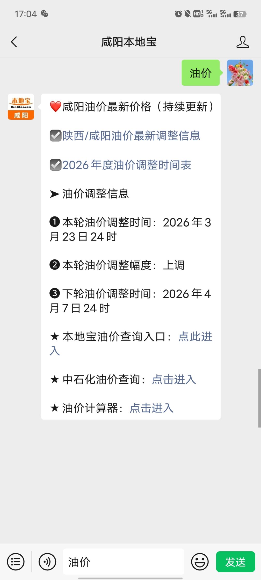 温馨提示:微信搜索公众号【咸阳本地宝】,关注后在对话框回复【油价】查看咸阳2026油价上调/下调最新通知,92号、95号汽油最新价格、全国/咸阳油价查询、计算器、油价日历等信息。